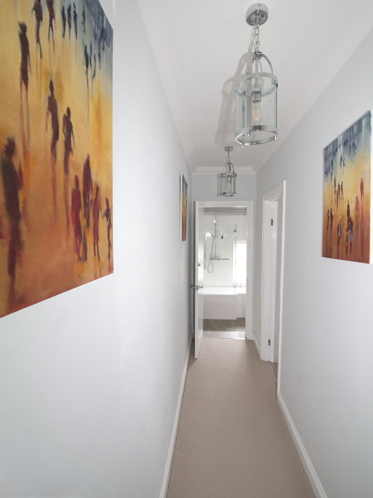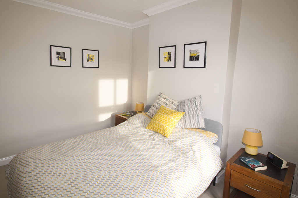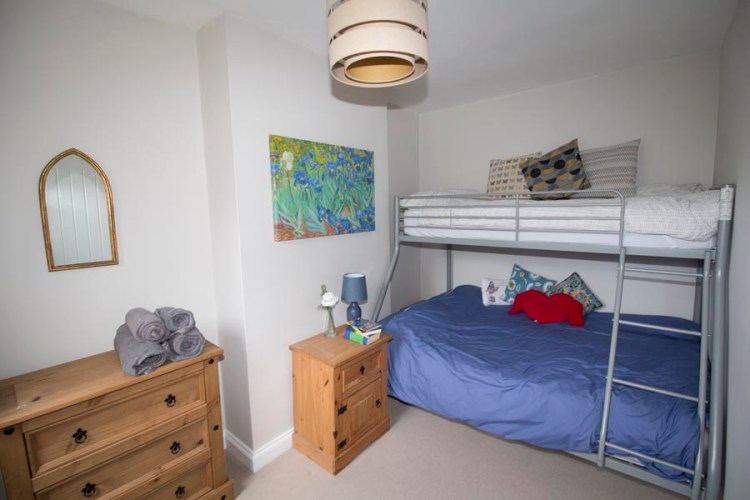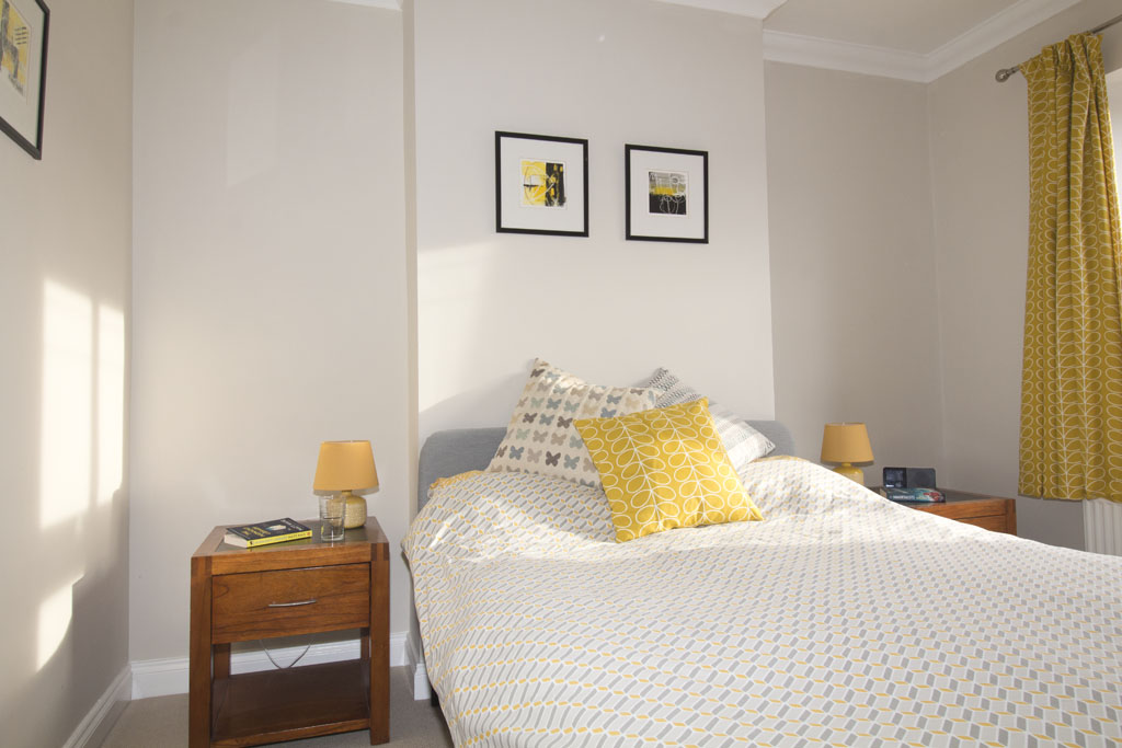 A lovely spacious, light double bedroom, with plenty of storage. Comprising double, full height wardrobe, and large double fronted chest of drawers. Two bedside tables with lamps and an alarm clock radio.